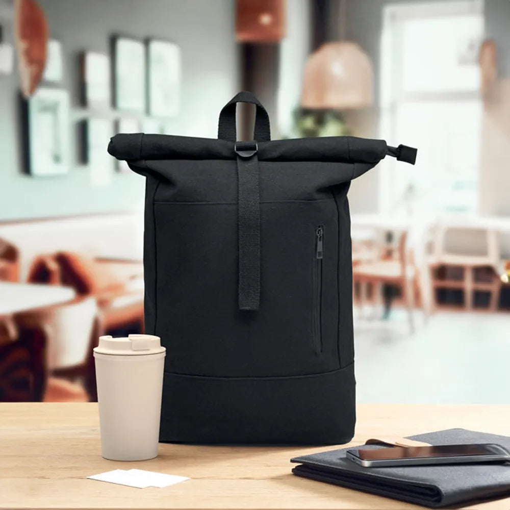 Deze rolltop laptoprugzak is vervaardigd uit gerecycled pre-consumer katoen (70%) en gerecycled polyester (30%) met een stevige stofdikte van 340 g/m². Het duurzame materiaal en de doordachte afwerking maken deze tas tot een milieubewuste keuze zonder concessies aan comfort of functionaliteit. Geschikt voor laptops tot 15 inch en ideaal voor dagelijks gebruik.