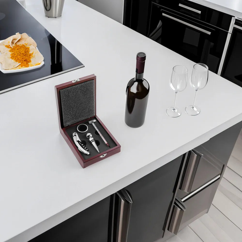 De set bevat een kurkentrekker, wijnstopper, wijnschenker en foliesnijder. Elk item is vervaardigd uit duurzaam metaal voor een lange levensduur en een professionele uitstraling. De houten cassette biedt een stevige en stijlvolle opbergoplossing.