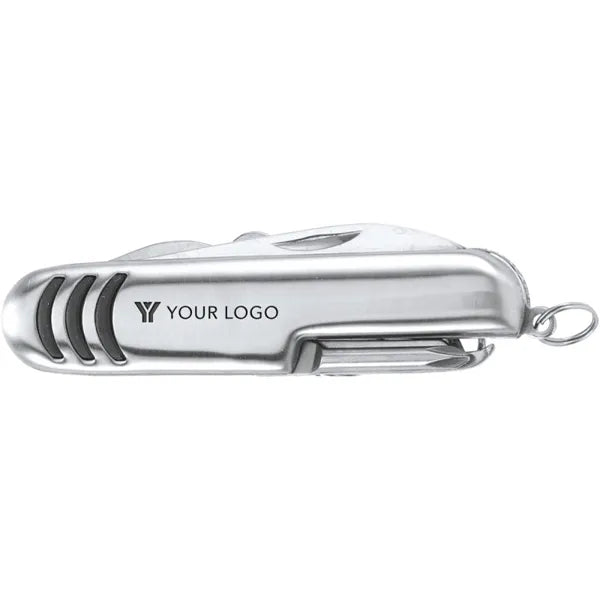 Dit compacte 7-delige zakmes is een multifunctioneel hulpmiddel voor onderweg. Vervaardigd uit duurzaam roestvrij staal en voorzien van een sleutelring, zodat het eenvoudig aan een sleutelbos, tas of riemlus bevestigd kan worden. Perfect voor dagelijks gebruik, outdooractiviteiten of als praktisch relatiegeschenk.
