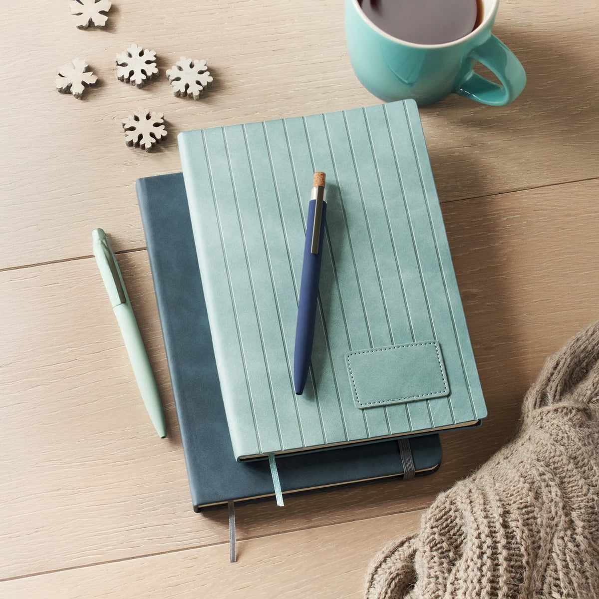 De omslag bestaat voor 40 procent uit gerecycled post-consumer materiaal en 60 procent PU. De binnenzijde bevat 160 gelinieerde pagina’s van 70 grams gerecycled papier (80 vellen), wat dit notitieboek tot een milieuvriendelijke keuze maakt. Ideaal voor organisaties die duurzaamheid en stijl willen combineren.