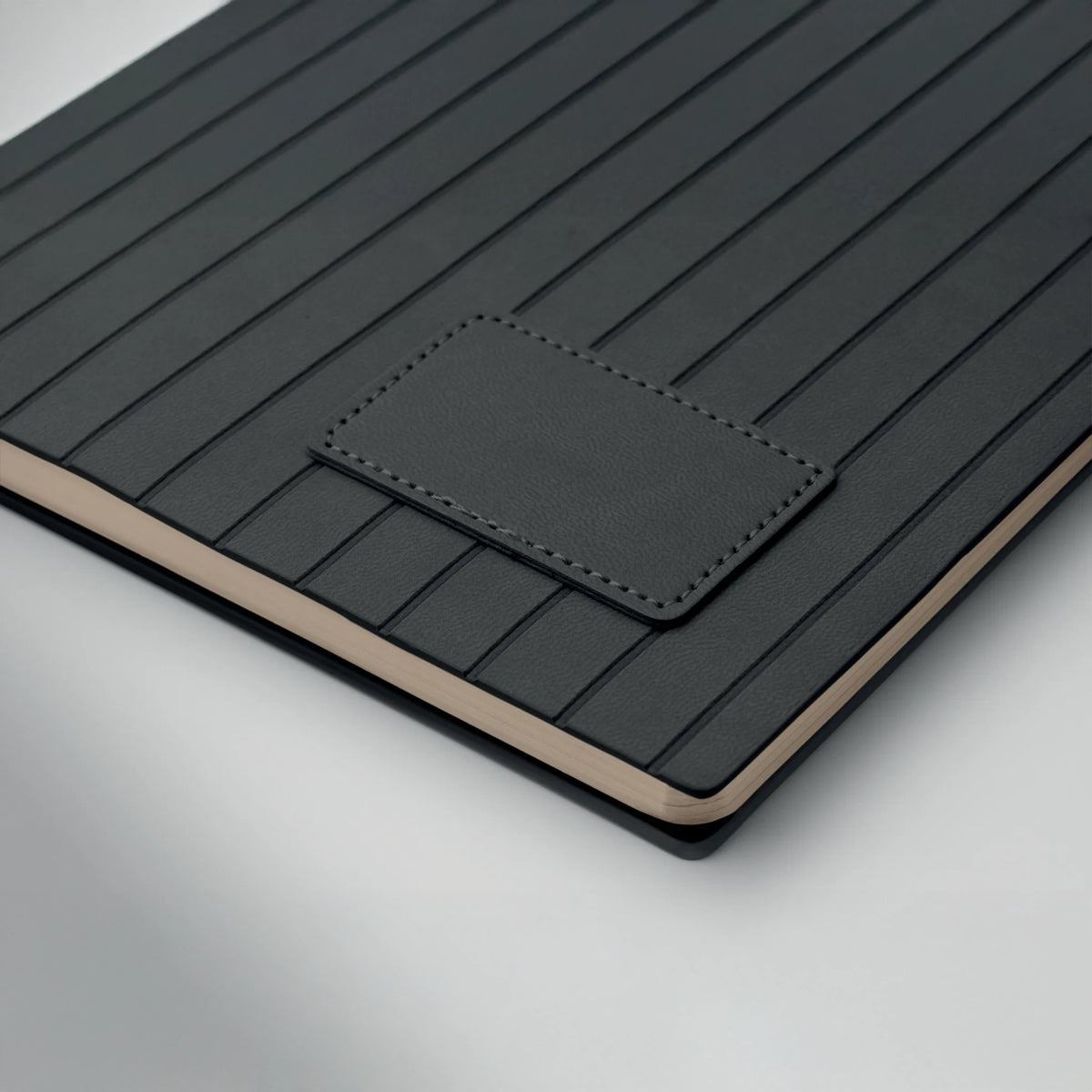 Dit stijlvolle A5 notitieboek combineert een luxueuze uitstraling met duurzame materialen. De zachte smokey PU kaft is deels gemaakt van gerecycled post-consumer materiaal en voorzien van een subtiele ribbelstructuur met een effen PU patch op de voorkant. Een perfecte keuze voor dagelijks gebruik, kantoor, vergaderingen of als relatiegeschenk.