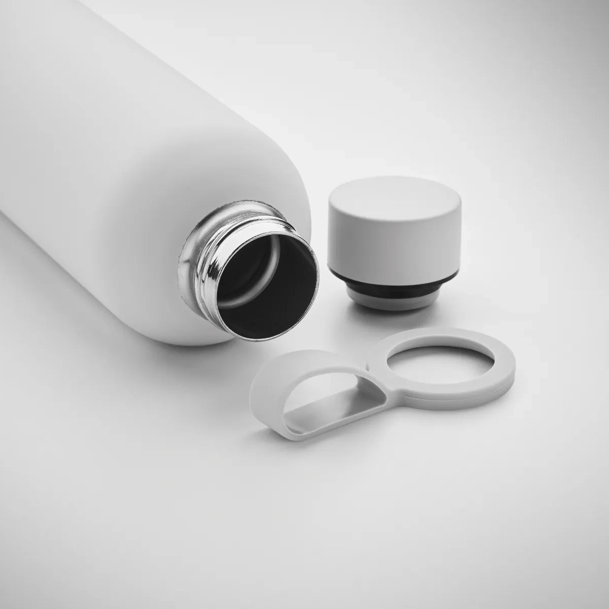 De buitenkant is afgewerkt met een rubberen coating die niet alleen modern oogt, maar ook zorgt voor extra grip en comfort. De geïntegreerde siliconen draaglus maakt het eenvoudig om de fles mee te nemen of te bevestigen aan een tas of rugzak. Praktisch, stijlvol en functioneel in één ontwerp.
