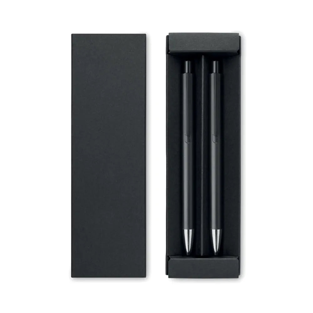 Deze 2-delige pennenset combineert duurzaamheid met een moderne uitstraling. De set bestaat uit een blauwschrijvende balpen en een inktloze grafietpen, beide vervaardigd uit gerecycled aluminium. Geleverd in een gerecycled papieren doosje is dit een verantwoorde en stijlvolle keuze voor promotionele doeleinden of professioneel gebruik.