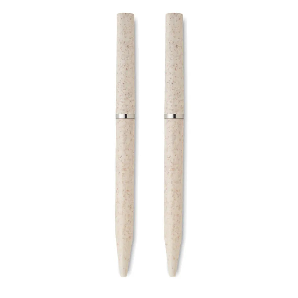 Beide pennen zijn geproduceerd uit een combinatie van tarwestrovezels en gerecycled ABS, wat de ecologische voetafdruk verlaagt. De natuurlijke uitstraling sluit perfect aan bij een groene huisstijl.