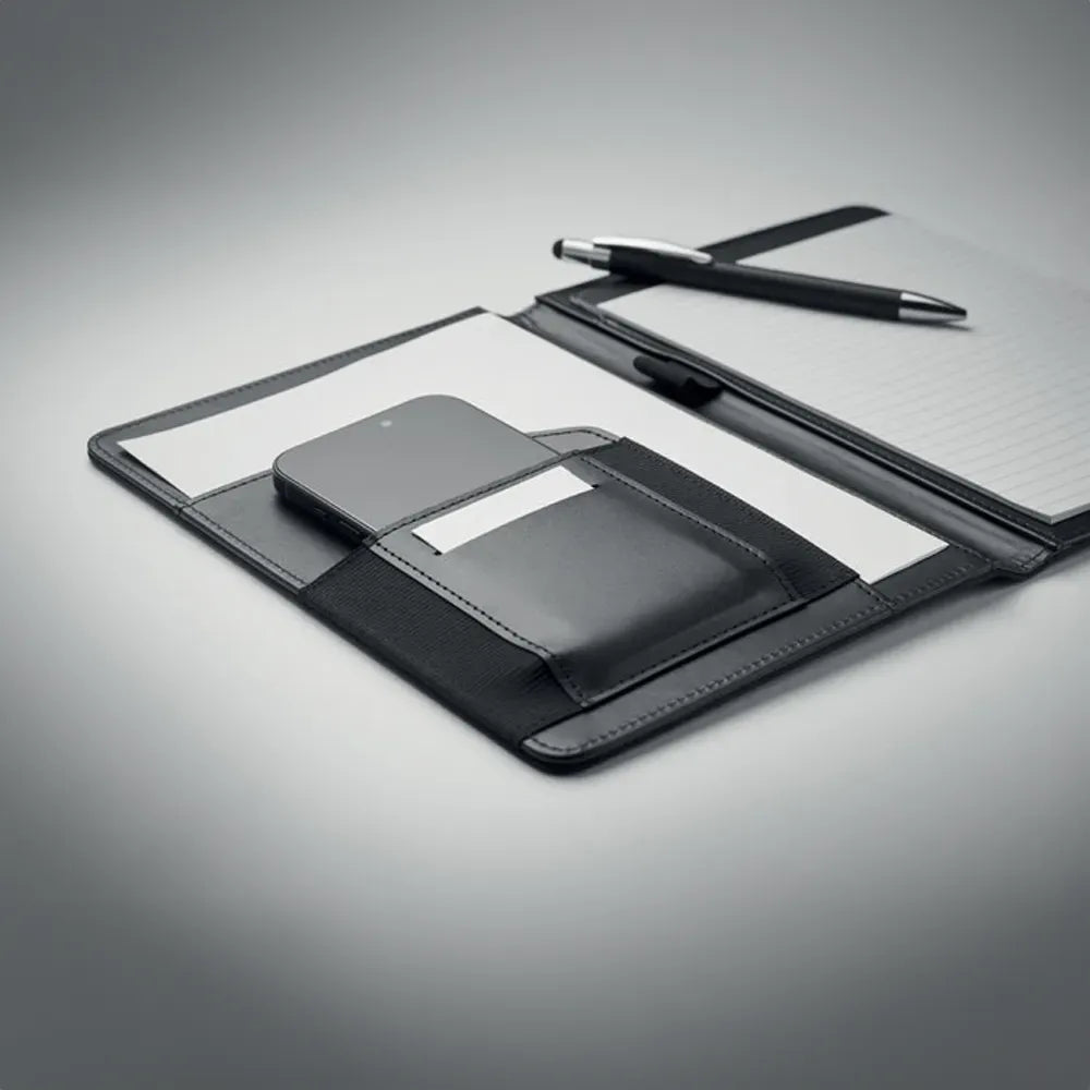 De conferentiemap bevat een A5-notitieblok met 40 wit gelinieerde pagina’s, geproduceerd van duurzaam bamboepapier. Het notitieblok is eenvoudig vervangbaar, waardoor de map langdurig inzetbaar blijft.