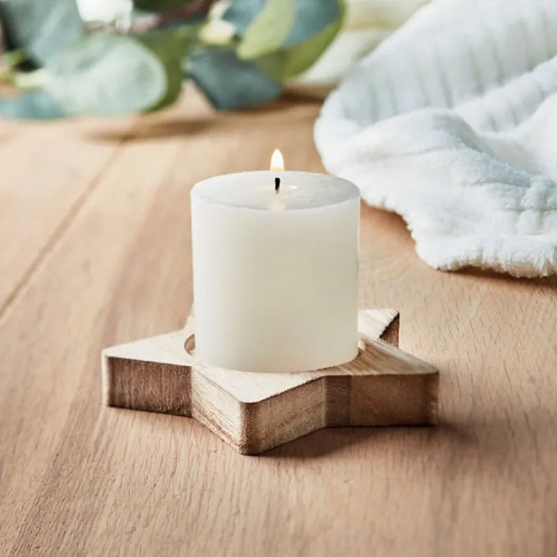 Breng sfeer en stijl in huis met deze charmante houten kaarsenhouder in stervorm, inclusief een heerlijke vanillegeurkaars. Ideaal als decoratie én promotieartikel.