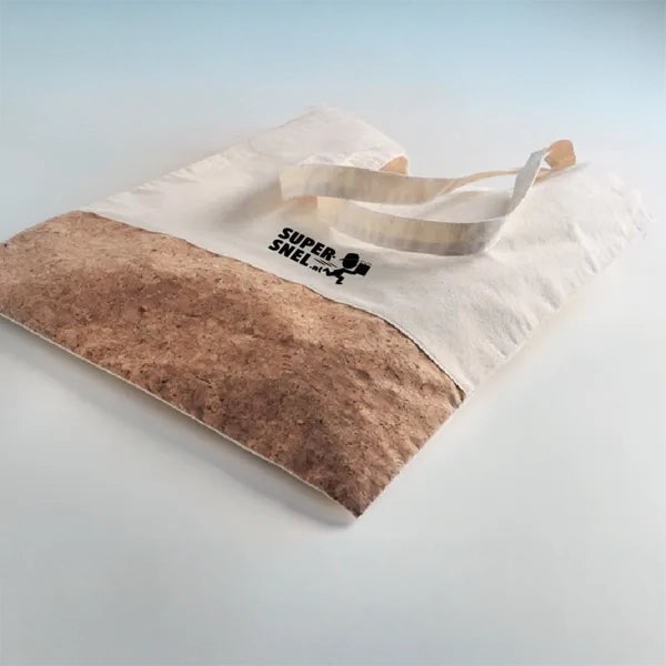 Onze katoenen boodschappentas met kurkdetail aan de onderzijde biedt een stijlvolle en duurzame oplossing voor je dagelijkse boodschappen. Met lange hengsels is deze tas comfortabel te dragen, zowel in de hand als over de schouder.