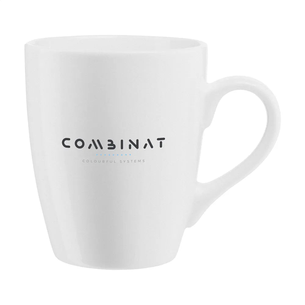 De mok is leverbaar in een klassieke witte uitvoering of met een speelse gekleurde buitenzijde. Beide varianten zijn uitstekend te combineren met een bedrukking naar keuze, wat deze mok ideaal maakt als relatiegeschenk of promotiemateriaal.