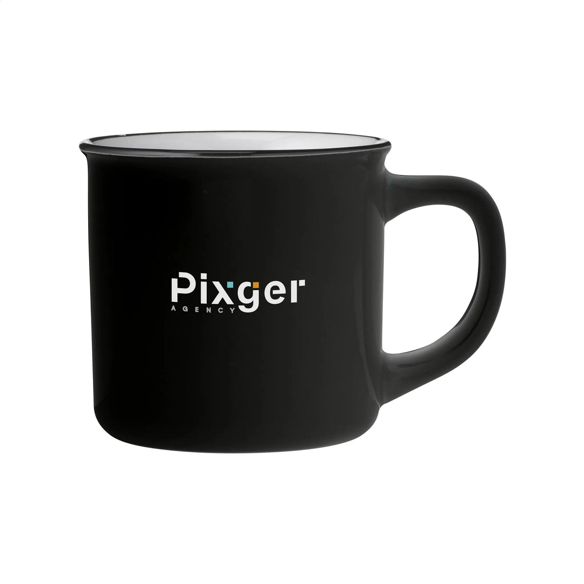 Deze keramische mok van 320 ml combineert klassieke retro-elementen met moderne functionaliteit. De nostalgische vormgeving maakt hem uniek en aantrekkelijk, terwijl het hoogwaardige keramiek zorgt voor een prettige drinkervaring. Een stijlvolle keuze voor thuis, op kantoor of als promotieartikel.