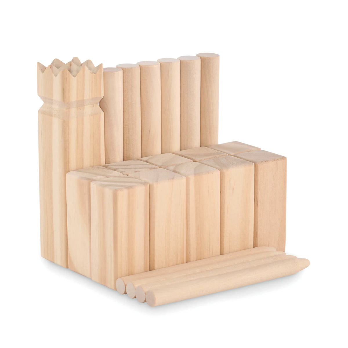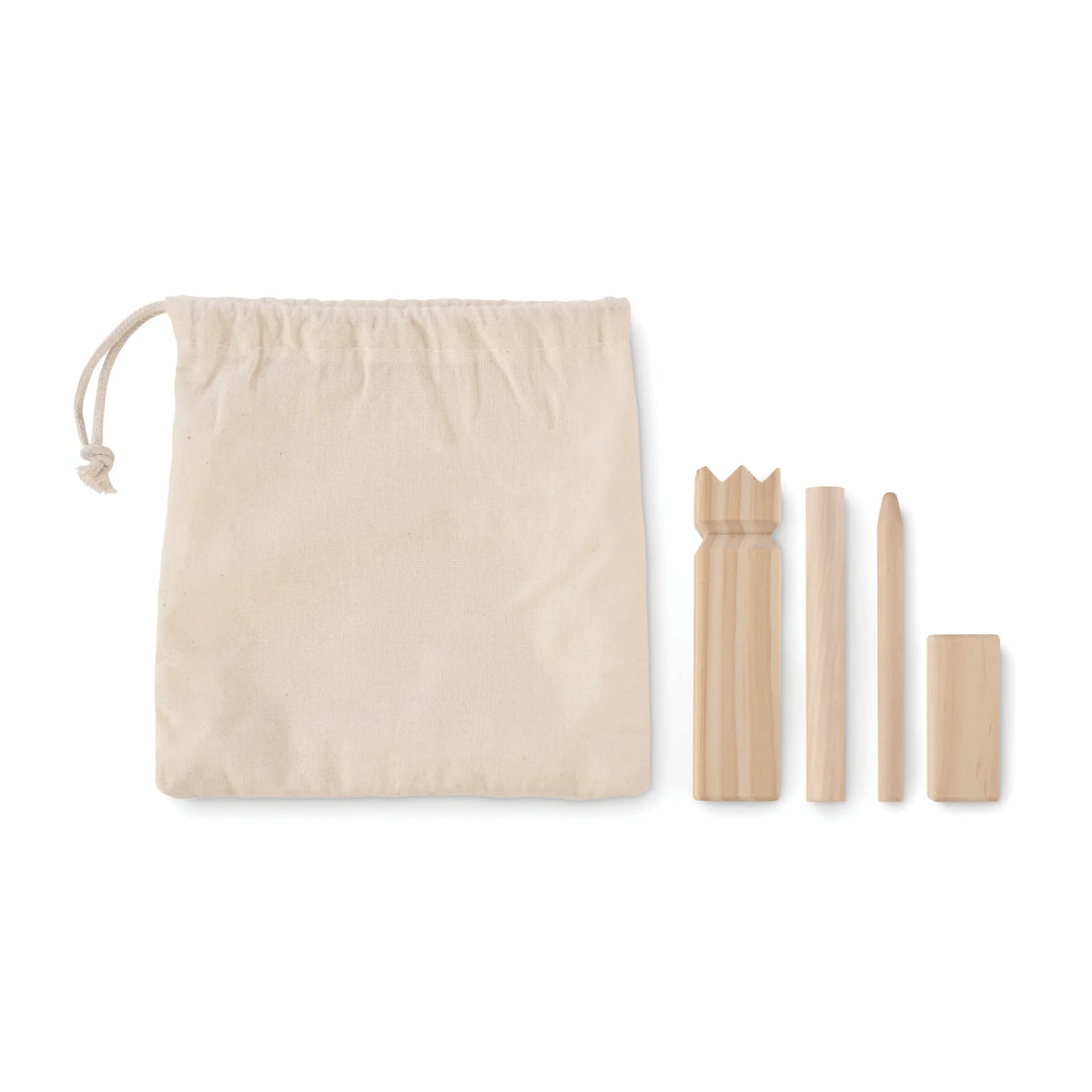 Dit compacte werpspel is gemaakt van stevig dennenhout en wordt geleverd in een praktische katoenen tas met trekkoord. Leuk voor een korte pauze, een speelse activiteit tijdens events of als verrassend relatiegeschenk. Geschikt voor jong en oud.