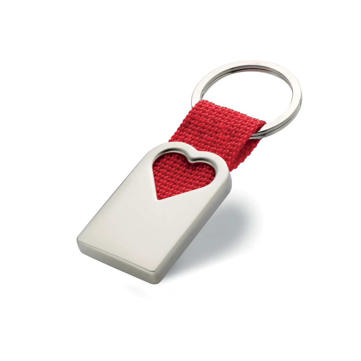 Deze metalen sleutelhanger met hartvormige uitsparing heeft een matte afwerking en is voorzien van een stijlvol polyester bandje. Een subtiele, elegante sleutelhanger die direct de aandacht trekt en geschikt is voor dagelijks gebruik.