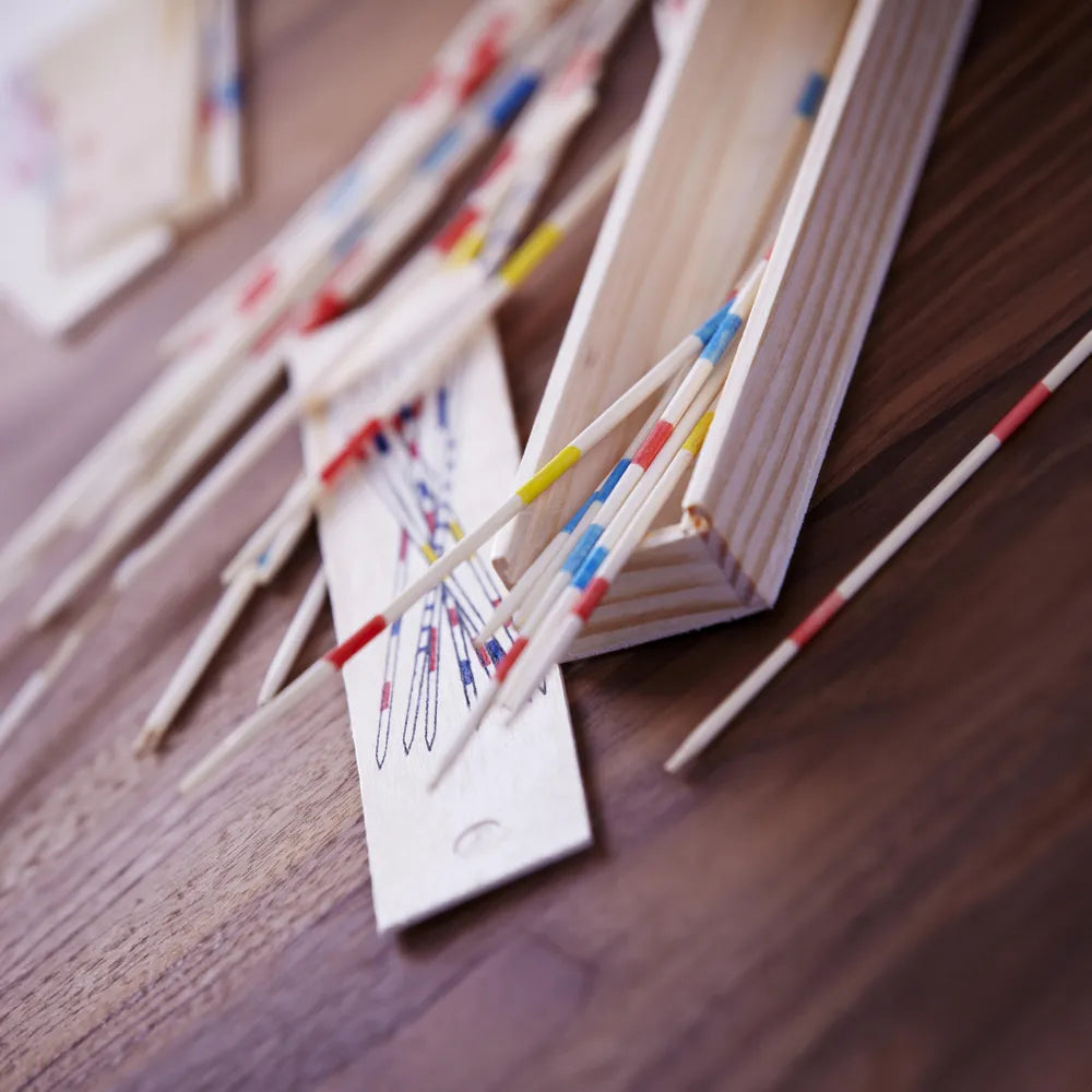 De stevige houten verpakking beschermt de stokjes en maakt het spel eenvoudig op te bergen. Ideaal om mee te nemen op vakantie, in de klas of als vermaak tijdens een pauze.
