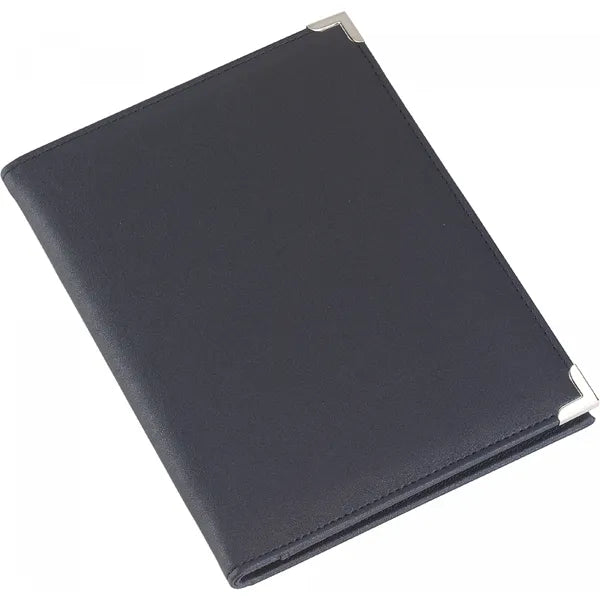 De PU omslag geeft de map een luxe en stevige afwerking. De metalen hoeken – zilver bij blauw en goud bij zwart – versterken de uitstraling én beschermen de randen. Door jouw logo op de voorkant te laten bedrukken, straalt elke map direct herkenbaarheid en klasse uit.