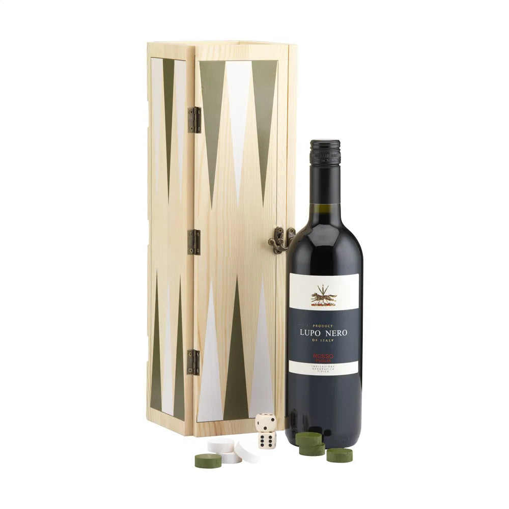 Naast ruimte voor één fles wijn biedt deze wijnkist een volledig functioneel backgammonbord. De bijgeleverde houten speelstukken en canvas zakje maken het geheel compleet. Ideaal voor spelletjesavonden, borrels of als bijzonder relatiegeschenk met een creatieve twist.
