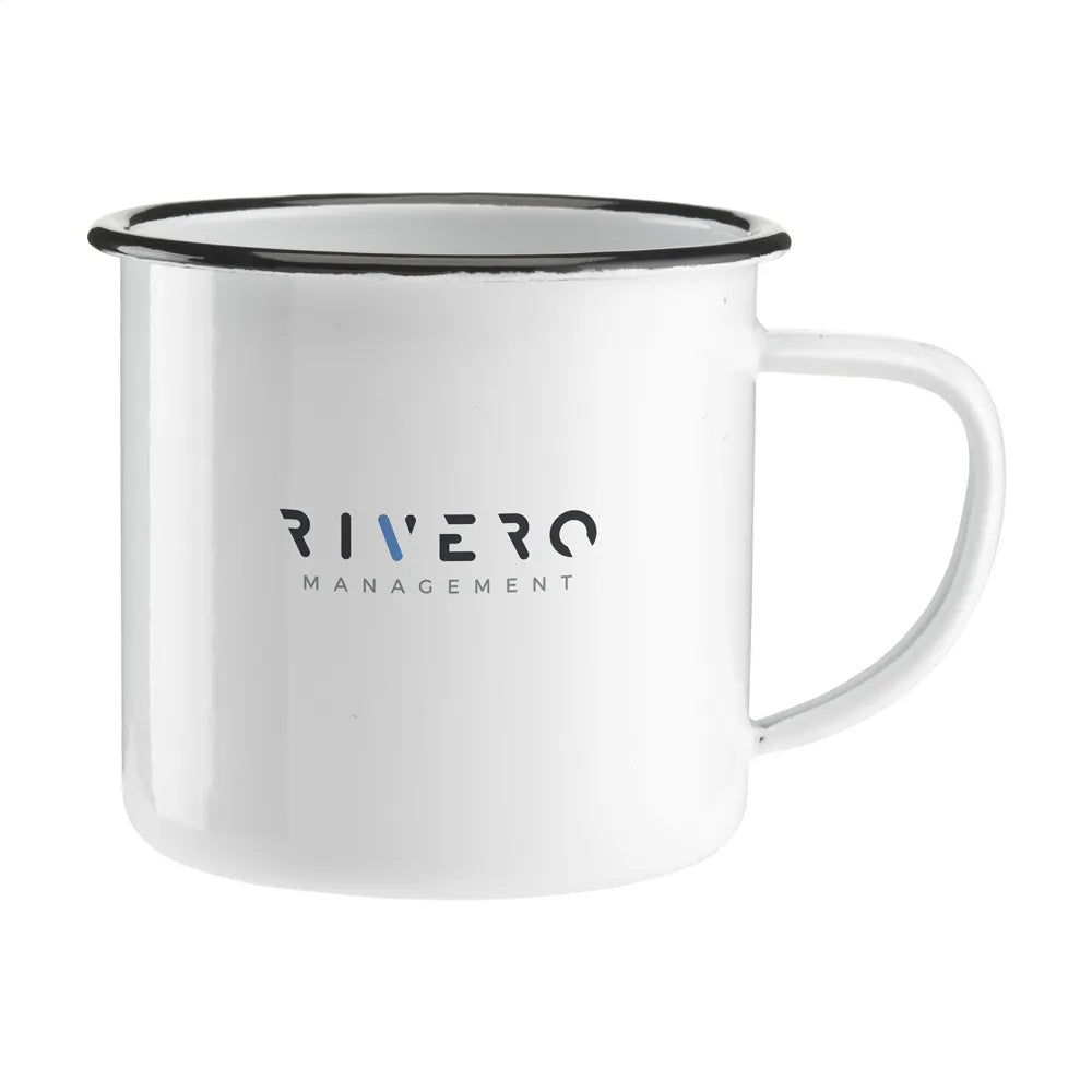 De mok bestaat uit een metalen kern met een beschermende emaillelaag. Kleine onregelmatigheden zoals puntjes, kleurverschillen of lichte randafwijkingen zijn inherent aan het emailleerproces en maken deel uit van het karakter van dit product. Elke mok heeft hierdoor een unieke, authentieke uitstraling.