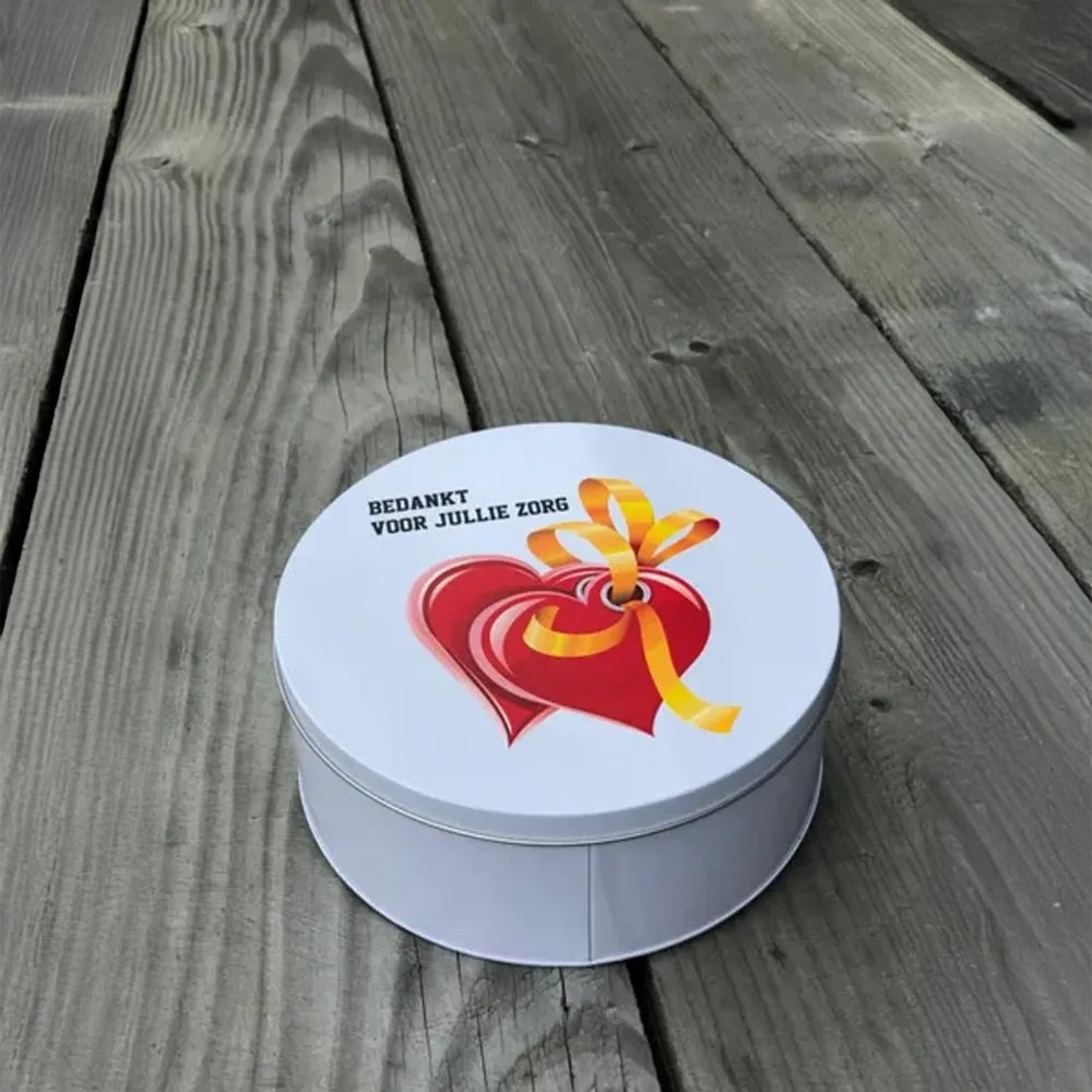 Het koekblik kan gepersonaliseerd worden met een logo, tekst of ontwerp via digitale bedrukking of tampondruk. Hiermee creëer je een blijvende indruk bij klanten, medewerkers of gasten.