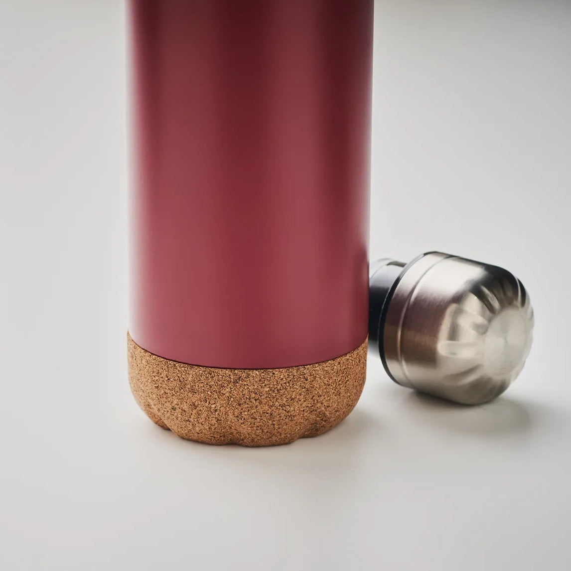 De fles is afgewerkt met een decoratief kurken element aan de onderzijde. Dit geeft de fles een natuurlijke uitstraling en biedt extra grip op gladde oppervlakken. Een mooi contrast met het strakke, moderne RVS-design.