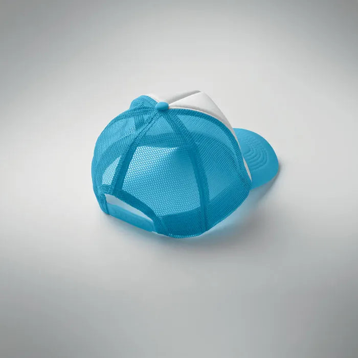 De cap is voorzien van een gladde, witte voorzijde die perfect geschikt is voor diverse druktechnieken zoals zeefdruk, transferdruk of borduren. De andere panelen zijn gemaakt van gekleurd mesh voor optimale ventilatie. Dankzij de 5-panel constructie ontstaat er een groot en egaal bedrukkingsvlak op het frontpaneel.